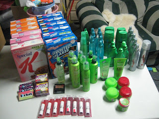 12 boxes of cereal (5 frosted miniwheats, 6 frosted flakes, 1 special k) - on sale 4/$10 - used $1 coupons on each one and got $3 RR back on each group of 4 ($12) = .75 ea